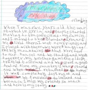 Yet the commentary written alongside this drawing of a seemingly carefree childhood tells a different, heart-breaking story: “When I was five years old the war started in Syria and people started moving to the safe cities… When I returned home it was completely destroyed and we travelled to Ireland and I miss my friends so much…”